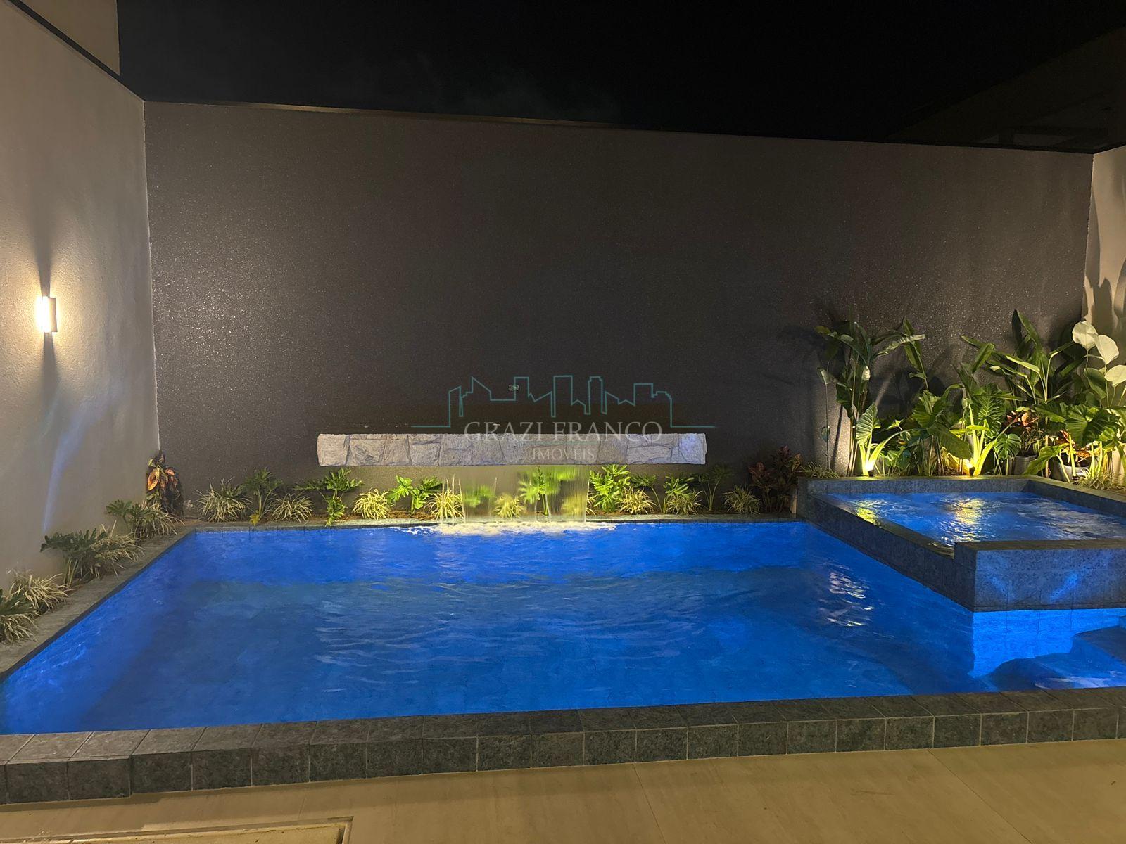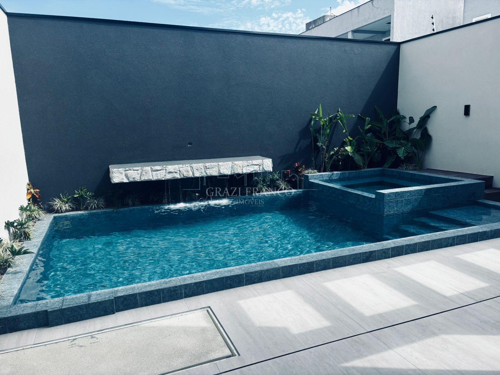 . Piscina aquecida em alvenaria revestido em porcelanato e cascata