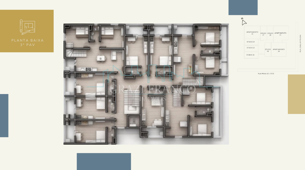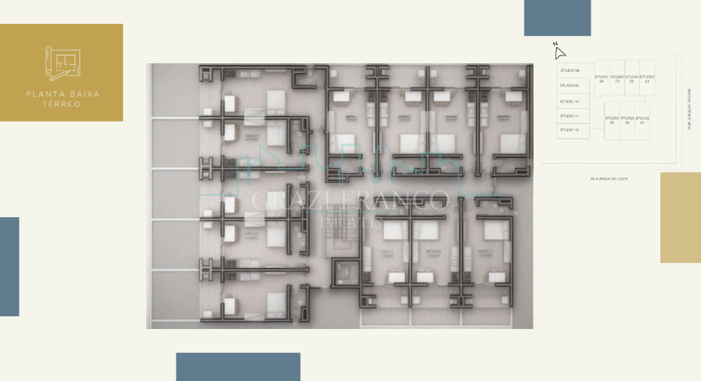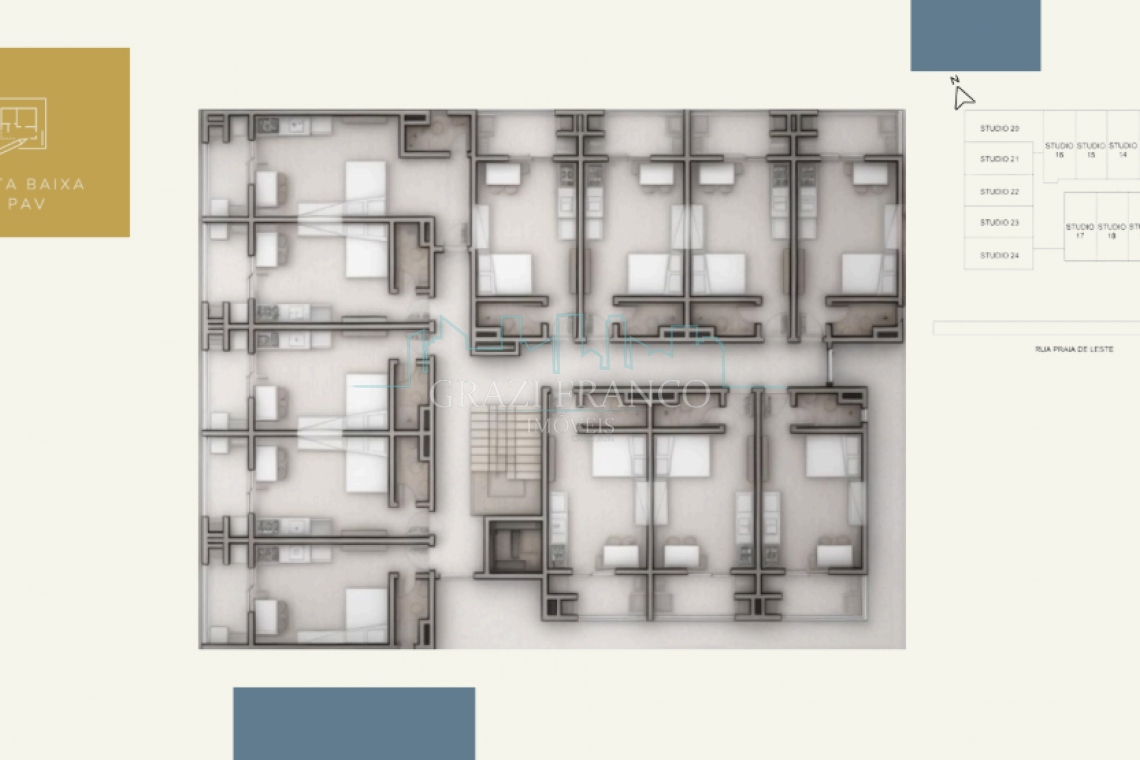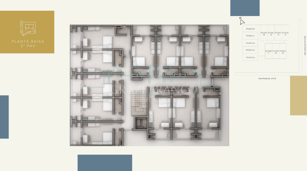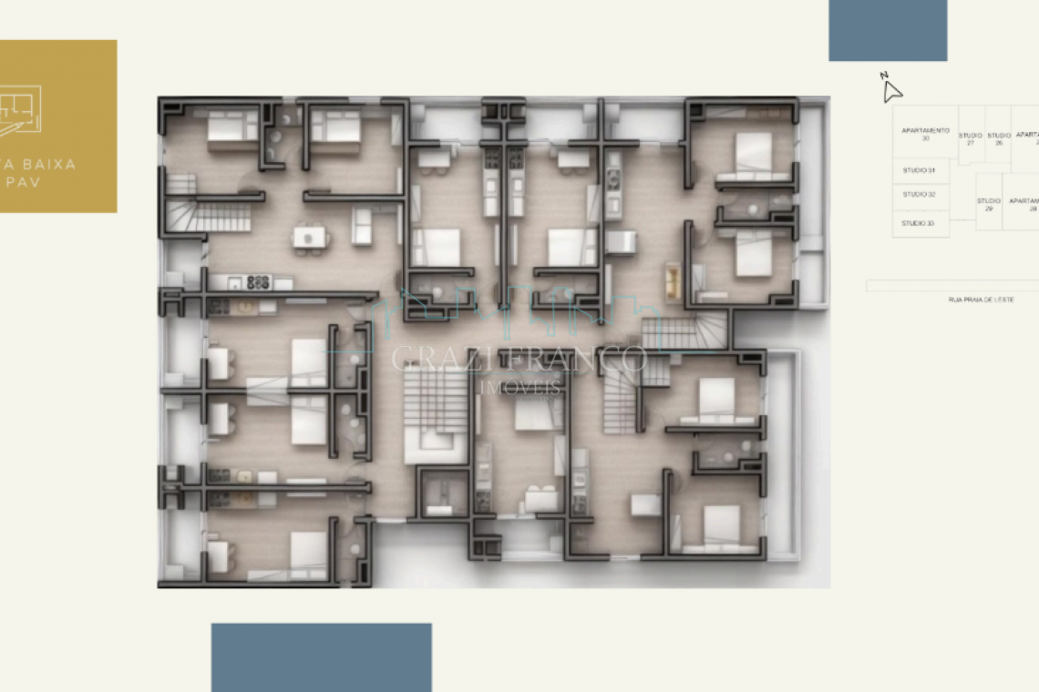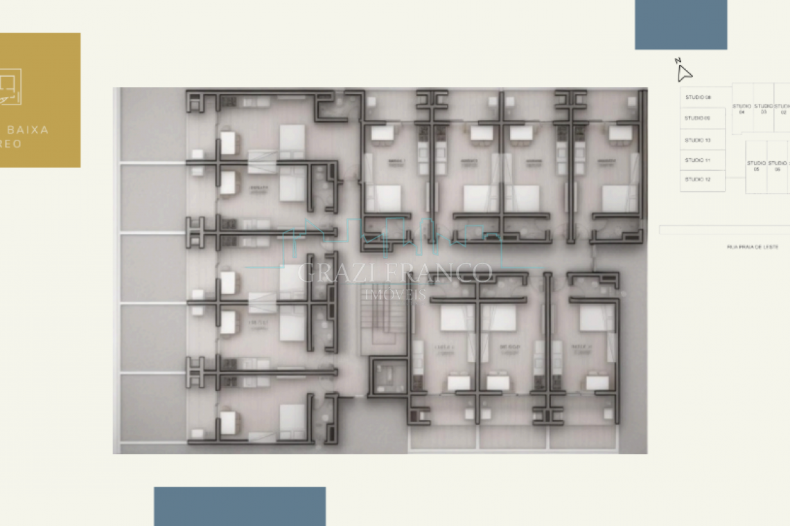 - Studios compactos e funcionais, com metragens que variam de 28,00m² a 42,00m²;