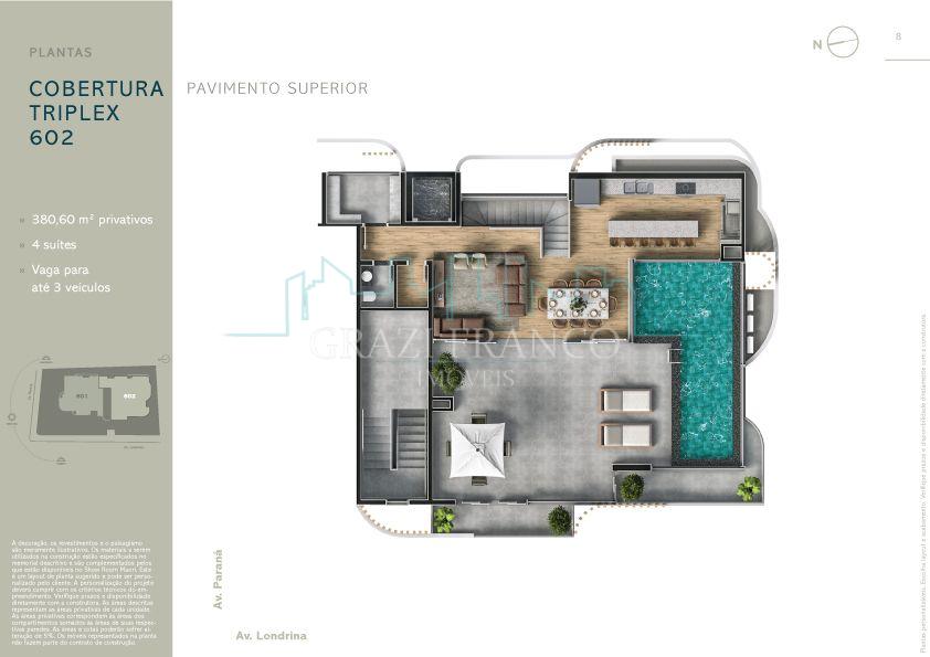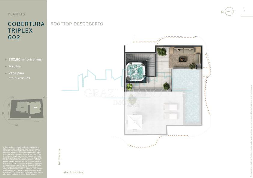 Cobertura Triplex com Rooftop e Spa no terceiro piso, sauna privativa, bar molhado, hidromassagem para 2 pessoas na suíte master, piscina aquecida com tratamento de ozônio.